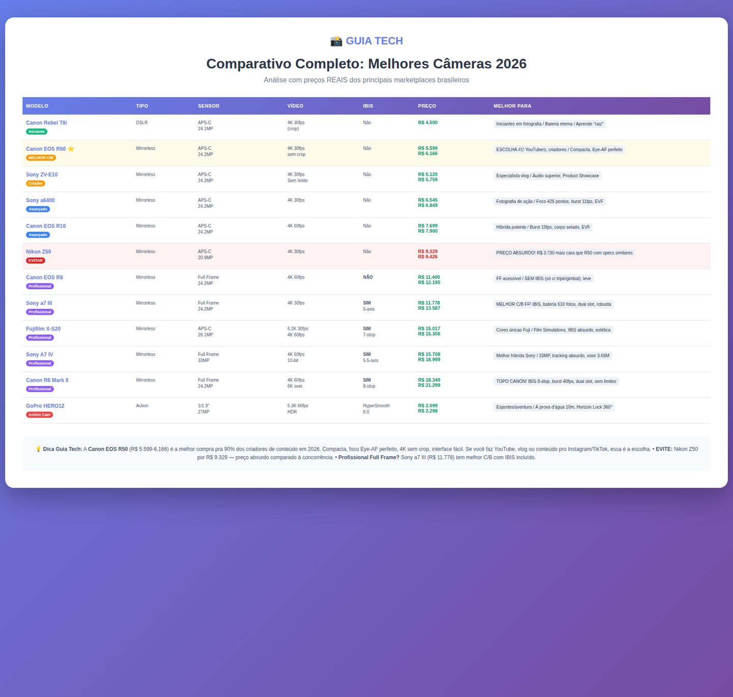 đĄ Dica Guia Tech: Essa tabela Ă© sĂł o começo. CĂąmera nĂŁo Ă© sĂł especificação â ergonomia, lentes disponĂveis e seu tipo de uso fazem TODA diferença.